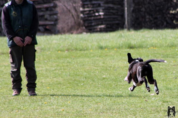 Eine Platzübung, bei der sich der Hund auf Befehl des HF aus der Grundstellung ins Platz begiebt der Hundeführer sich diesmal dreißig Schritte entfernt. Im Anschluss ruft er seinen Hund entweder auf dessen Namen oder auf „Hier!“ ab, worauf dieser sich schnell dem Hundeführer zu nähern und sich ohne weiteres Kommando gerade vor ihm abzusetzen hat, um zuletzt noch einmal hinten um sein Herrchen herum zu gehen, sodass er sich nun in der Grundstellungsposition befindet.